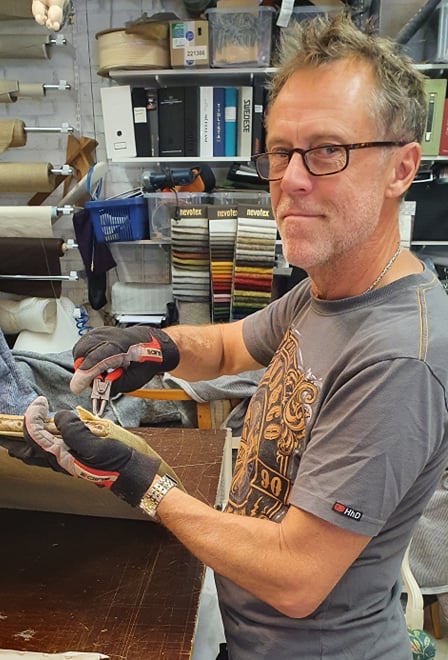 Besides my career as an editor, with 500+ books on my cv, I operate a business developing and selling sports glasses under my own brand name Velodrom (Velodrom is the business formally responsible for the Upholsterer's Craft). I also work as a paragliding instructor, as a home guard soldier in the Swedish Defence Forces, and occasionally, as illustrated in the photo, as a stripping assistant in my wife's upholstery workshop.
